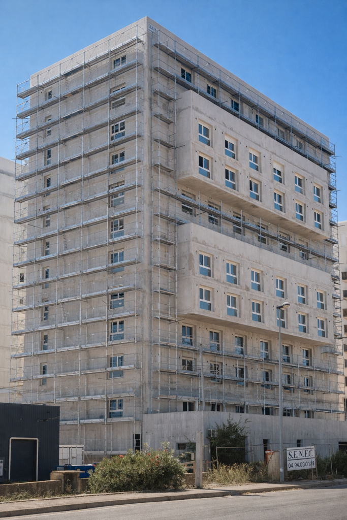 Focus photo : L’adaptation de l’échafaudage aux structures modernes et la propreté du chantier en site occupé.