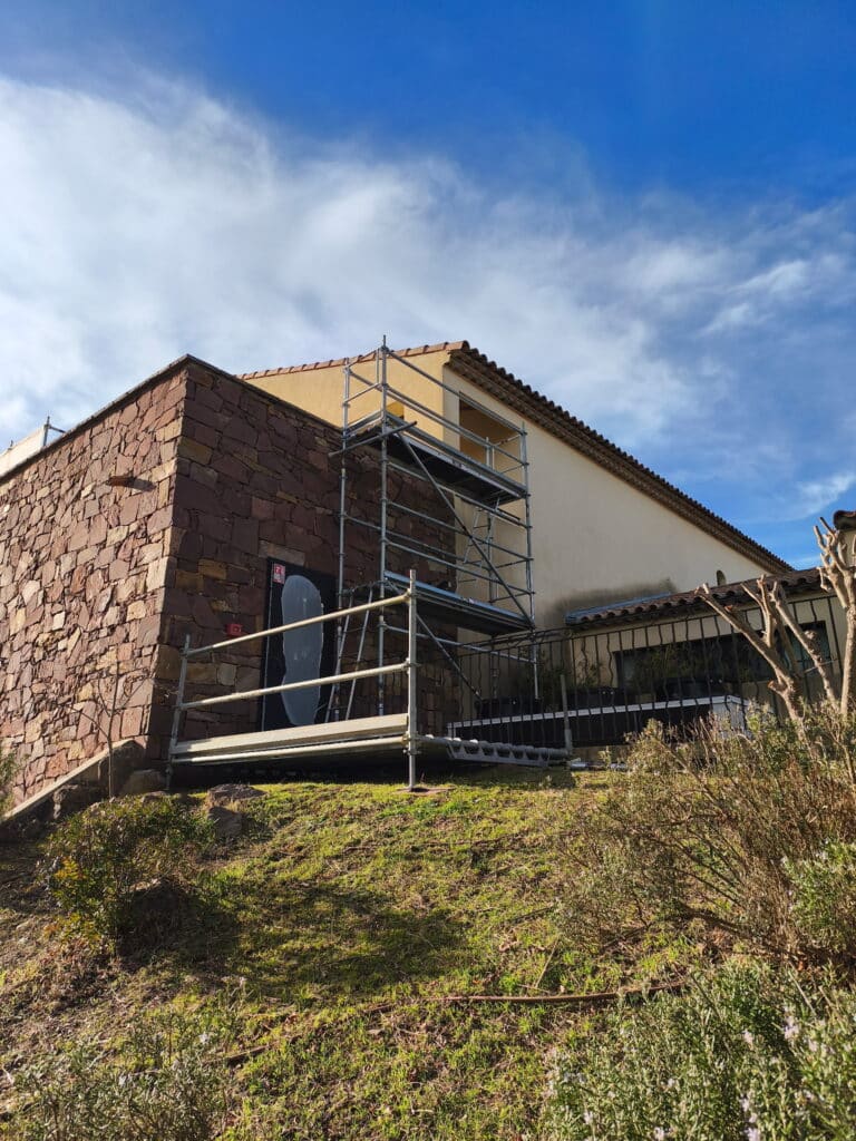 La solution O2N ACCESS : C’est ici que l’étude technique d’O2N ACCESS fait la différence. Nous avons fourni un matériel modulaire capable de s’adapter aux irrégularités du sol. Les photos mettent en évidence la complexité du départ de l’échafaudage et la rectitude parfaite des niveaux supérieurs, offrant aux peintres et maçons une plateforme de travail aussi sûre qu’au sol.